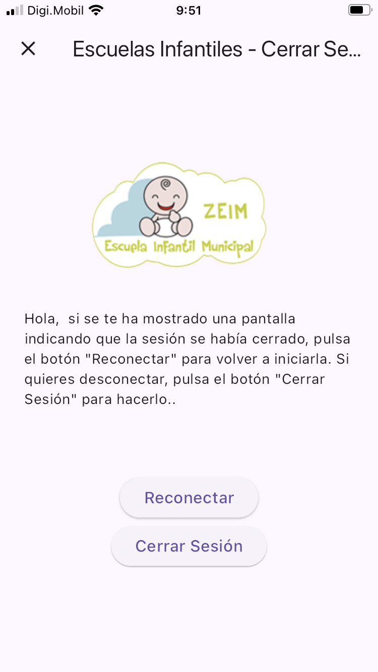 Si tenemos la aplicación abierta en segundo plano y no hemos realizado ninguna acción en ella durante un tiempo prolongado (1 hora), se producirá una desconexión y se nos mostrará un mensaje diciendo que la sesión ha cadudado o se nos pedirá que volvamos a introducir la contraseña. Si ocurre esto, lo único que debemos hacer es acceder a la página de "Ajustes" (tocando el icono del engranaje situado en la parte superior derecha de la aplicación), allí veremos un botón para "Reconectar", al tocarlo se volverá a iniciar la sesión y podremos continuar usando la aplicación normalmente.