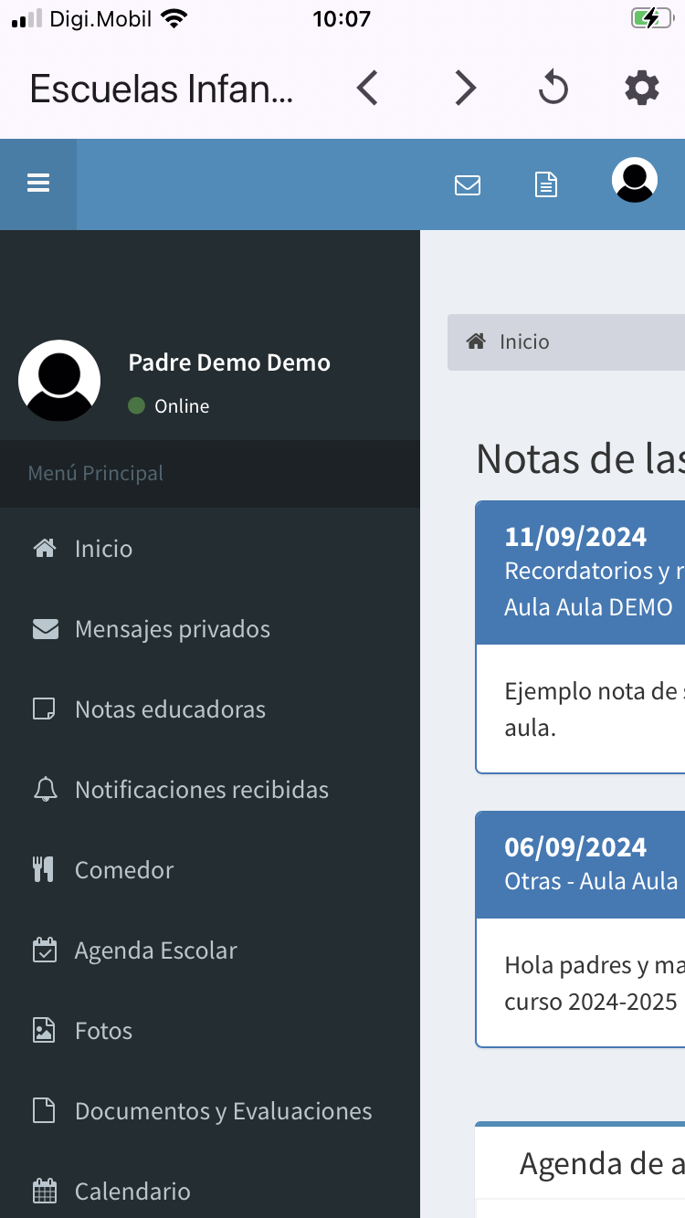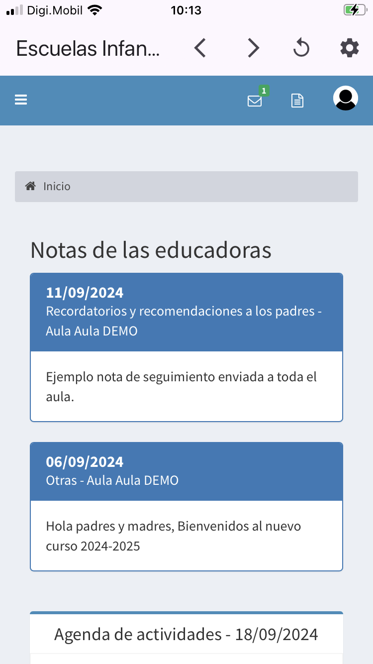 La aplicación muestra notificaciones cuando se encuentra en segundo plano o cerrada, las notificaciones se reciben cuando se detectan ciertos eventos: El usuario recibe un mensaje enviado por la escuela, desde la escuela responden a un mensaje enviado por el usuario, se publica una nota de seguimiento en la agenda, etc.