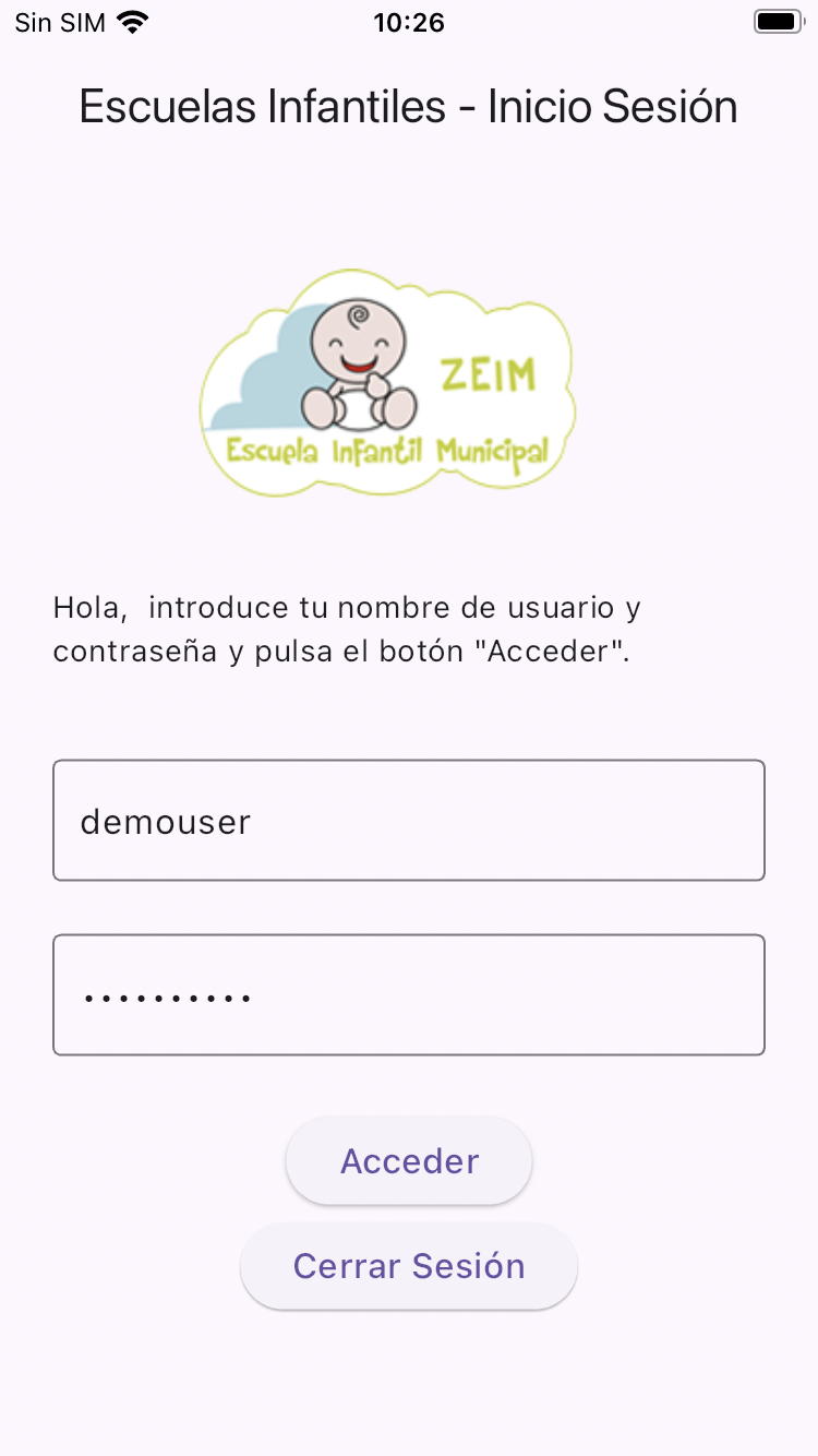 La primera vez que se accede a la aplicación nos aparecerá una pantalla en la que debemos introducir el nombre de usuario y contraseña que nos ha sido proporcionado por la Escuela infantil.
